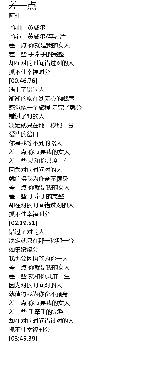 | [03:19.57] | chà yì diǎn nǐ jiù shì wǒ de nǚ rén |