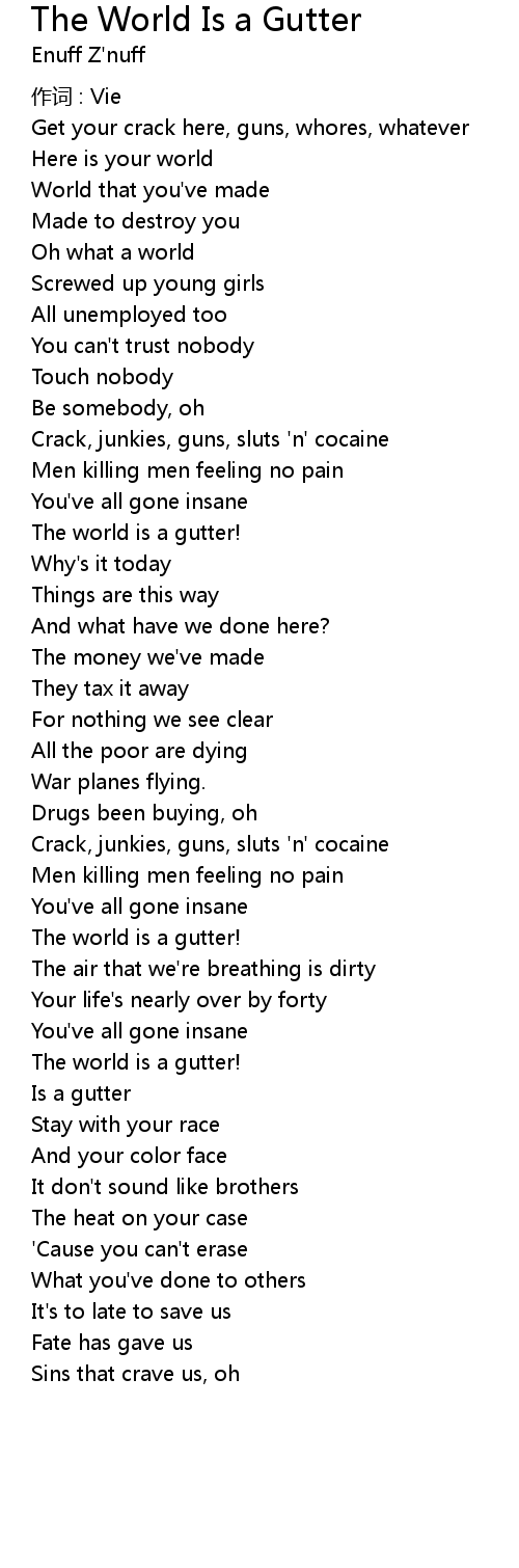 | Crack, junkies, guns, sluts ' n' cocaine | |