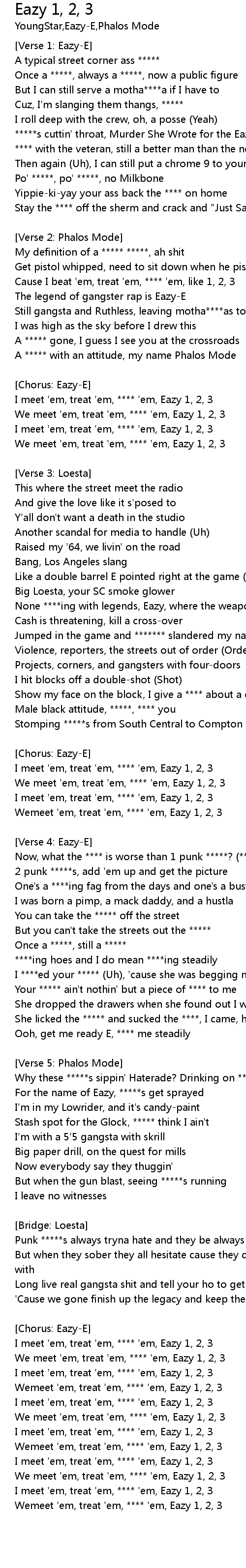 Wemeet 'em, treat 'em, **** 'em, Eazy 1, 2, 3 |