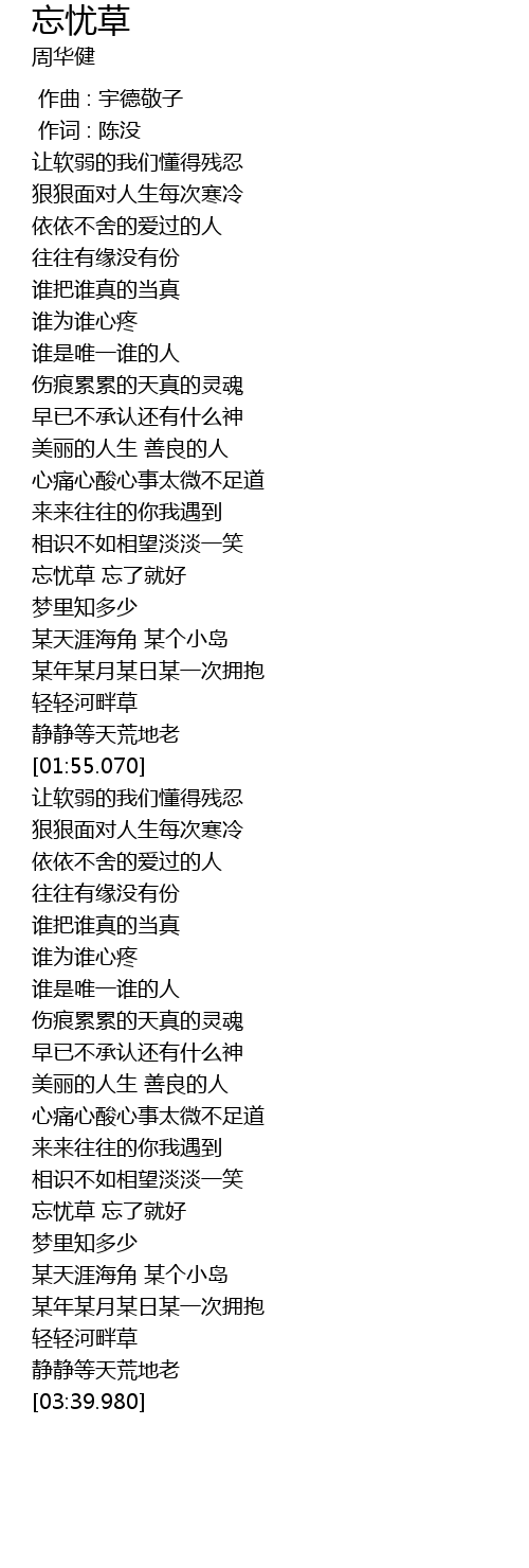 | [03:07.610] | wàng yōu cǎo wàng le jiù hǎo |