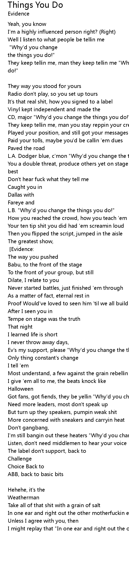 Sometimes for the good, sometimes for the bad.. [Chorus: x2] "Why'd you change the things you do!" |