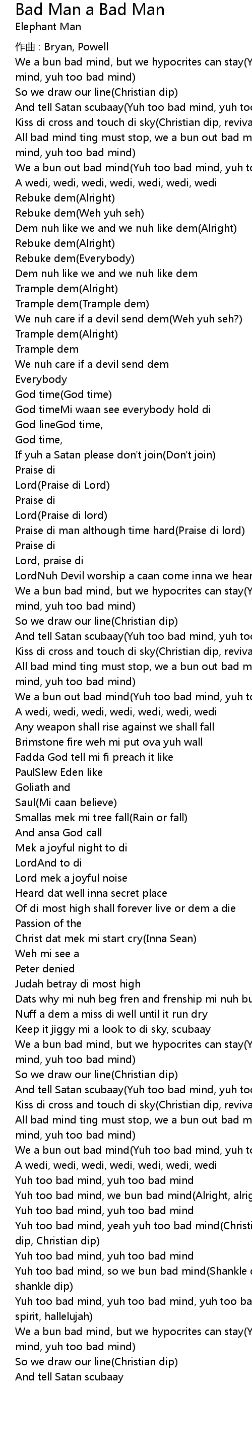| All bad mind ting must stop, we a bun out bad mind Yuh too bad mind, yuh too bad mind, yuh too bad mind | |
