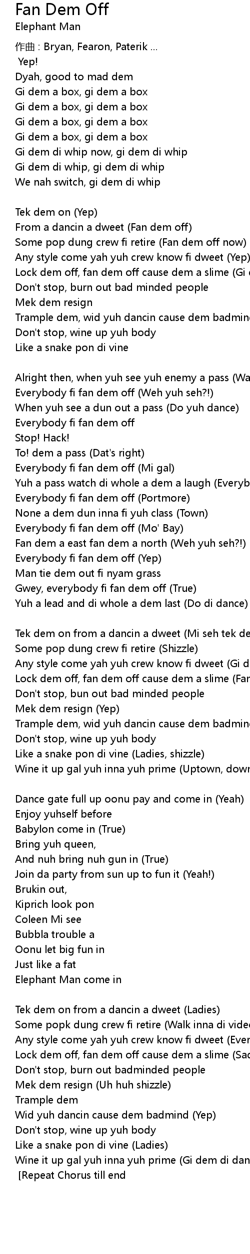| Everybody fi fan dem off Yep | |