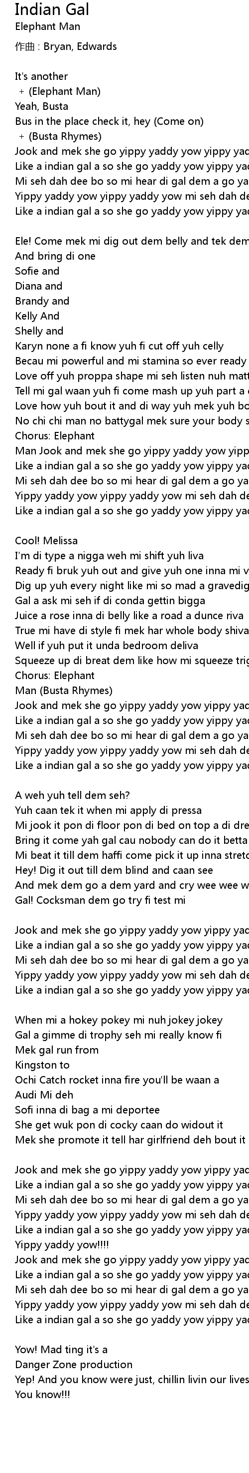 | Like a indian gal a so she go yaddy yow yippy yaddy yow yippy yaddy yow | |
