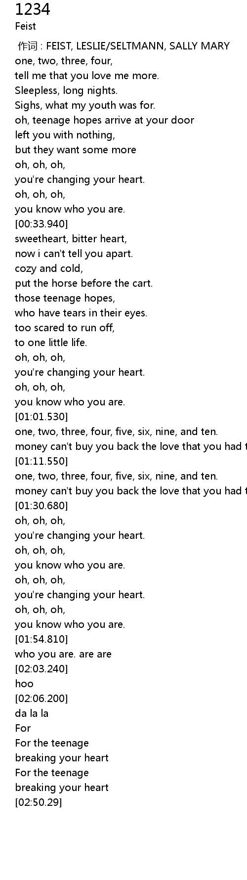 | [00:00.00] | 作词 : FEIST, LESLIE/SELTMANN, SALLY MARY |