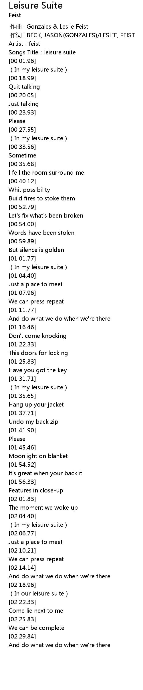 | [00:00.21] | 作词 : BECK, JASON(GONZALES)/LESLIE, FEIST |