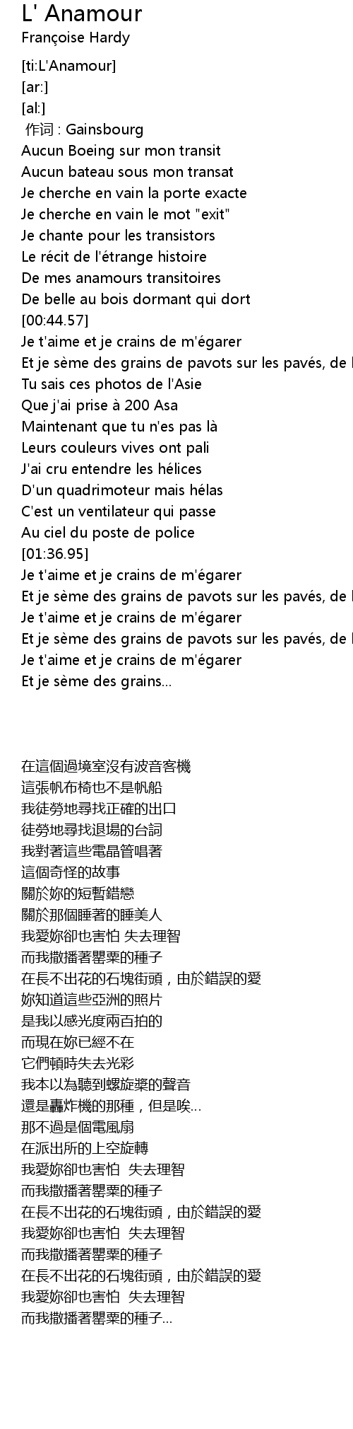 | [01:42.33] | Et je se me des grains de pavots sur les pave s, de l' anamour |