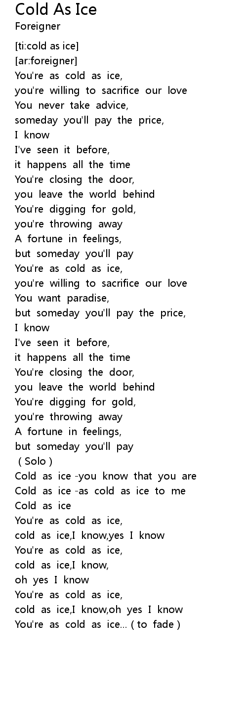 | [02:42.704] | You're as cold as ice...(to fade) |