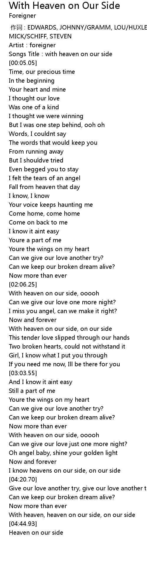 | [04:33.99] | With heaven, heaven on our side, on our side |