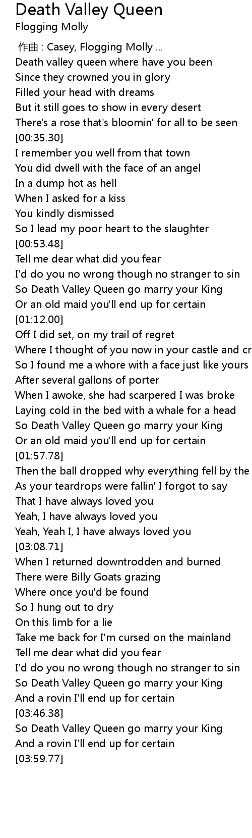 | [00:18.31] | Death valley queen where have you been |