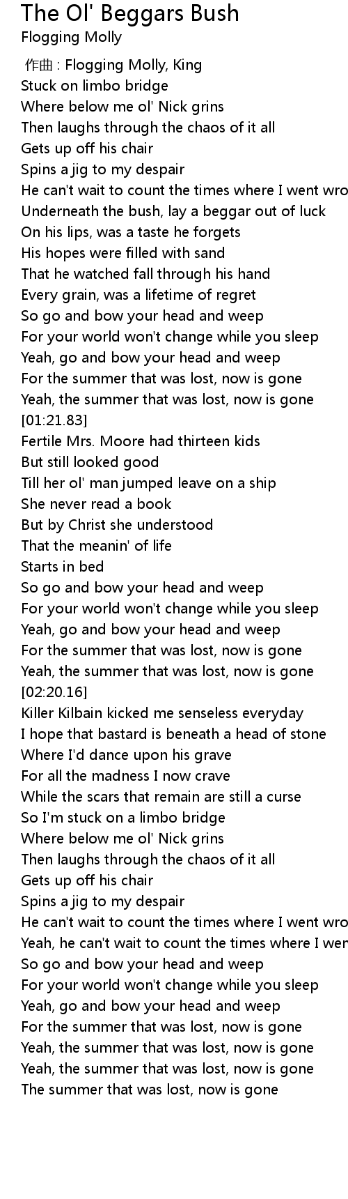| [00:31.86] | Underneath the bush, lay a beggar out of luck |