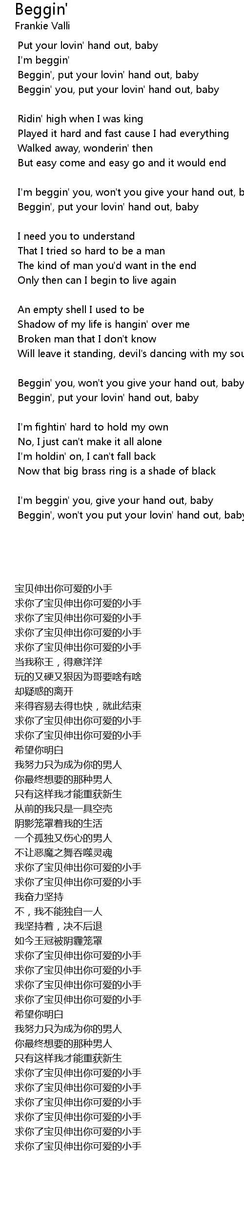 | Beggin' you, won't you give your hand out, baby | |