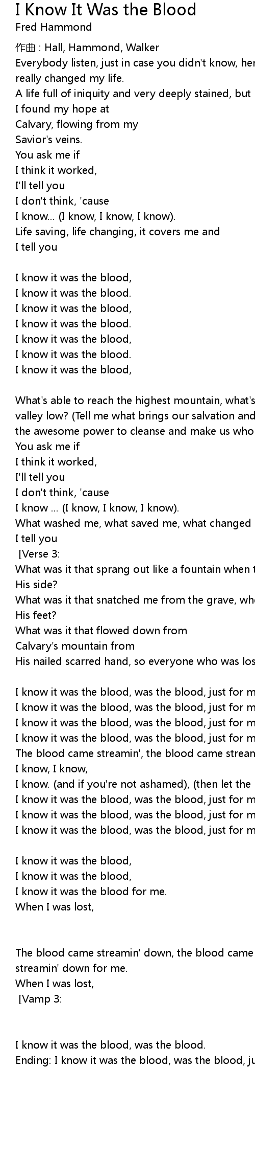 | The blood came streamin' down, the blood came streamin' down, the blood came streamin' down for me. | |
