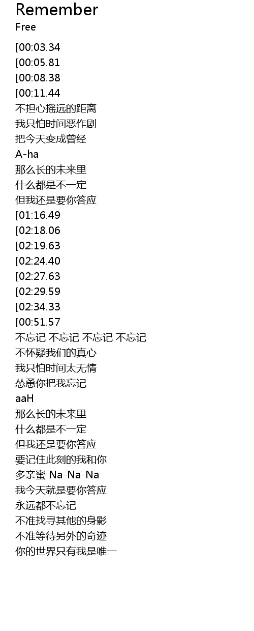 | [02:54.36][02:34.33][01:34.37][00:49.08] | 永远都不忘记 |