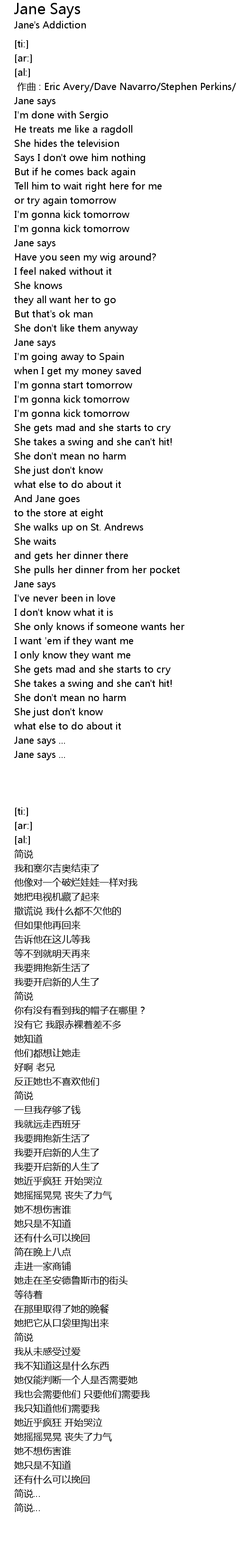 | [00:00.000] | zuo qu : Eric Avery Dave Navarro Stephen Perkins Perry Farrell |