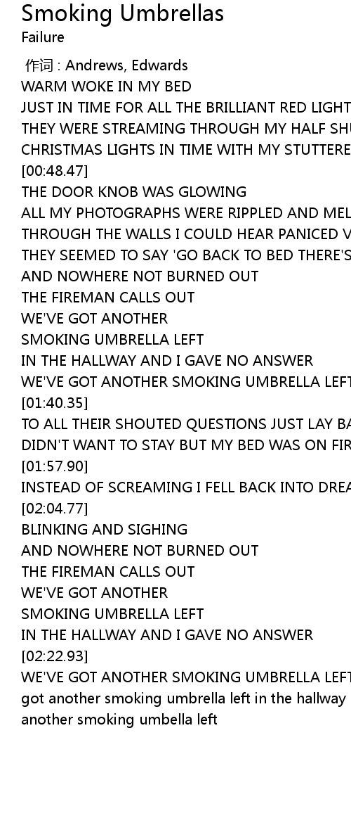 | [02:16.75] | SMOKING UMBRELLA LEFT |