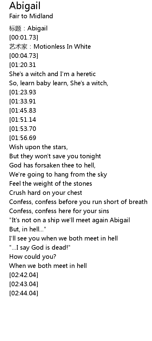 | [00:24.21][01:33.91][01:41.90] | Oh Abigail how could you do this to us? |