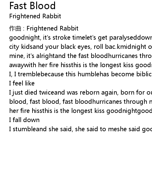 | I just died twiceand was reborn again, born for our dirty sinsand the fast blood, fast blood, fast bloodhurricanes through methen it rips my roof awaywith her fire hissthis is the longest kiss goodnightgoodnightand then | |