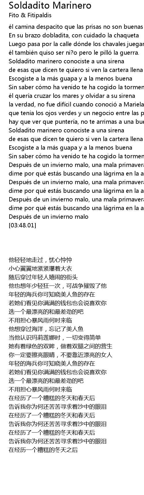 | [00:56.37] | Soldadito marinero conociste a una sirena |