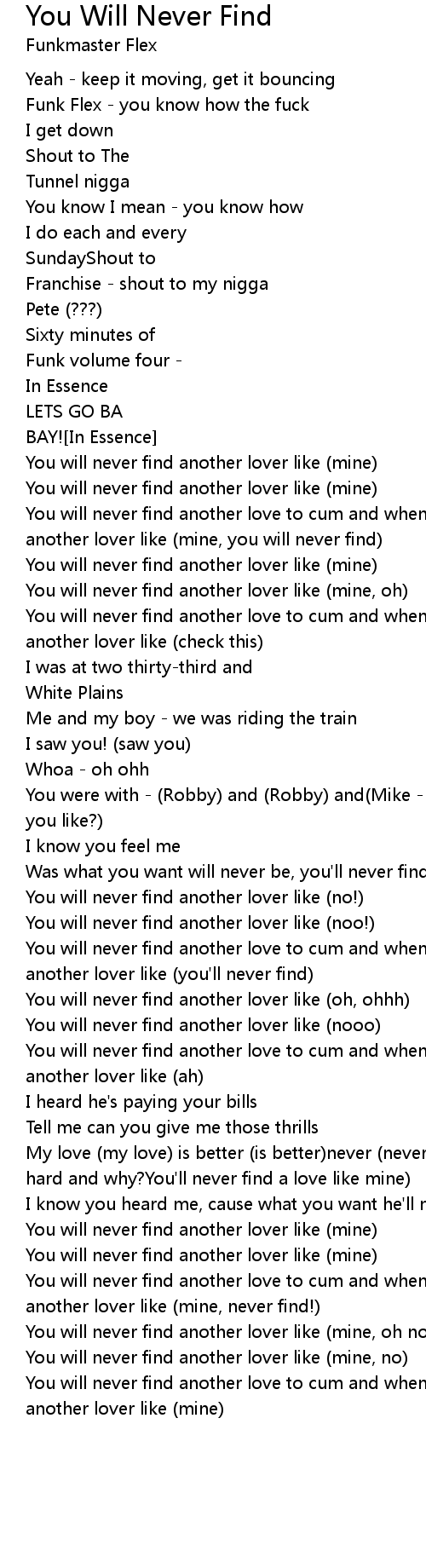 You will never find another love to cum and when its done you'llnever find another lover like (mine, never find!) |