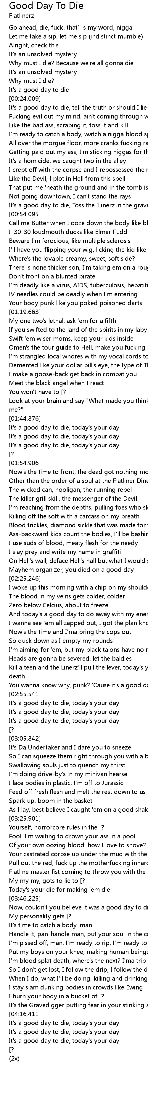| [00:51.598] | It's a good day to die, Toss the 'Linerz in the grave |