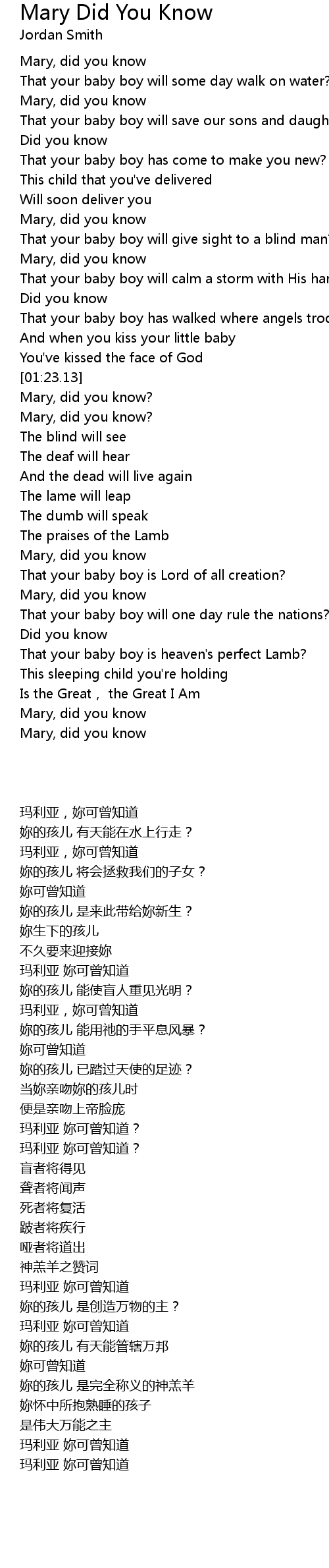 | [00:11.45] | That your baby boy will some day walk on water? |