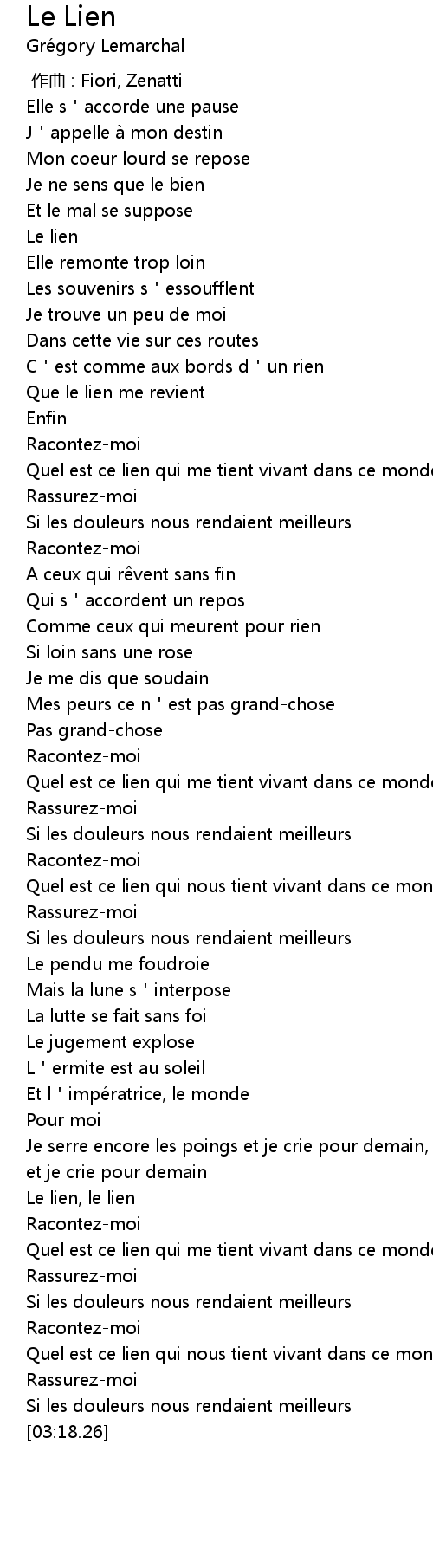 | [02:57.34] | Quel est ce lien qui nous tient vivant dans ce monde |