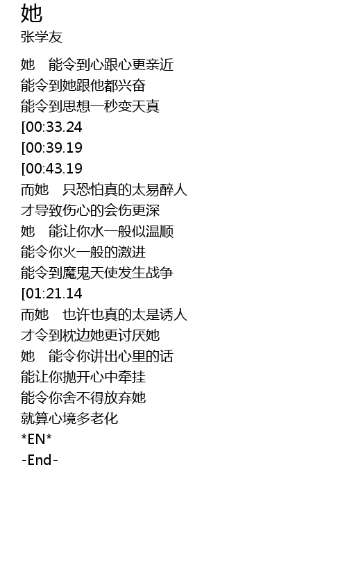 | [01:50.29][00:33.24] | 她 能令到身心都欠安份 |