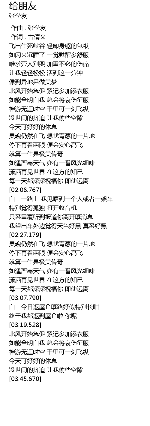 | [02:10.478] | bái: yí lù shàng wǒ jiàn wú dào yí ge rén huò zhě yī jià chē |