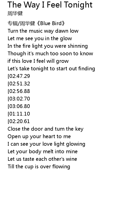| [03:18.32][02:47.29][01:48.87][00:46.50] | Cause the way I feel tonight |