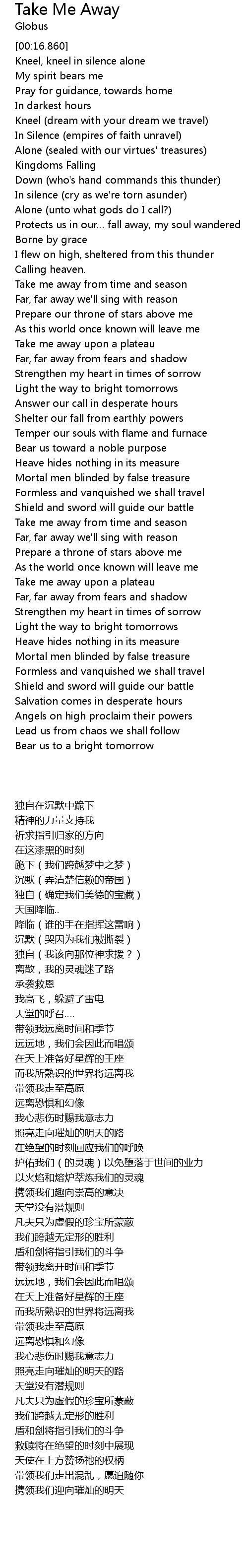 | [01:19.510] | Protects us in our… fall away, my soul wandered |