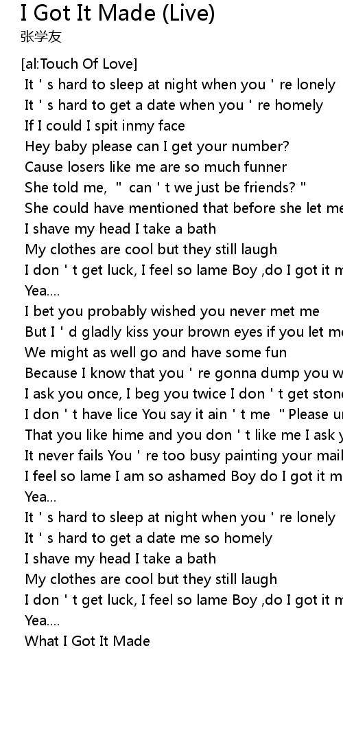 | [02:16.320] | I don't get luck, I feel so lame Boy ,do I got it made |