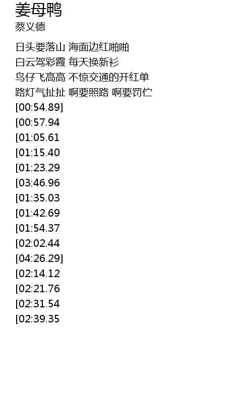 | [04:44.20][02:31.54] | 吃着姜母鸭 冬天免盖被嘛会流汗 |