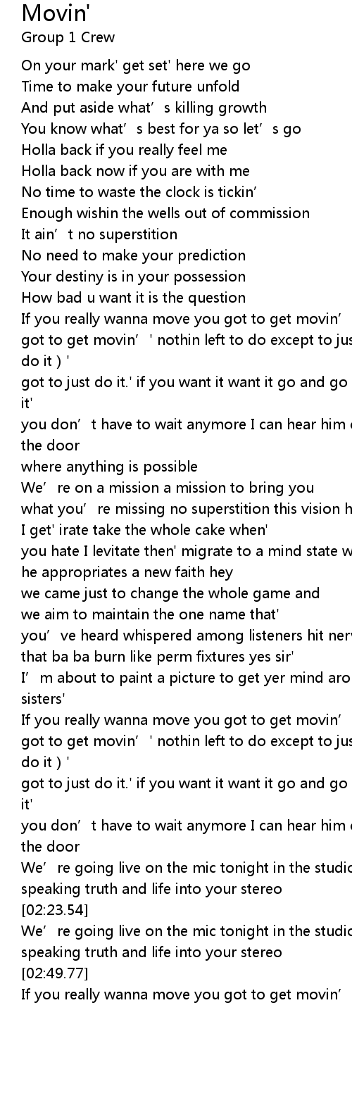 | [00:46.82] | If you really wanna move you got to get movin' movin' movin' |