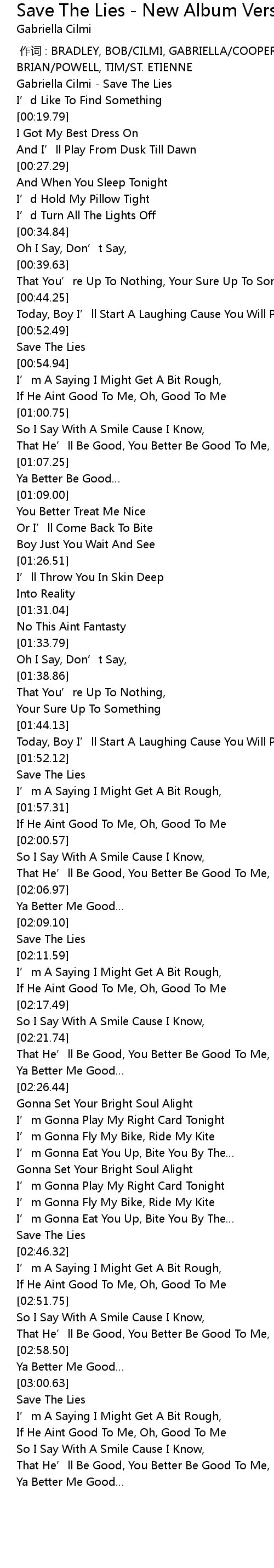| [00:01.66] | Gabriella Cilmi - Save The Lies |