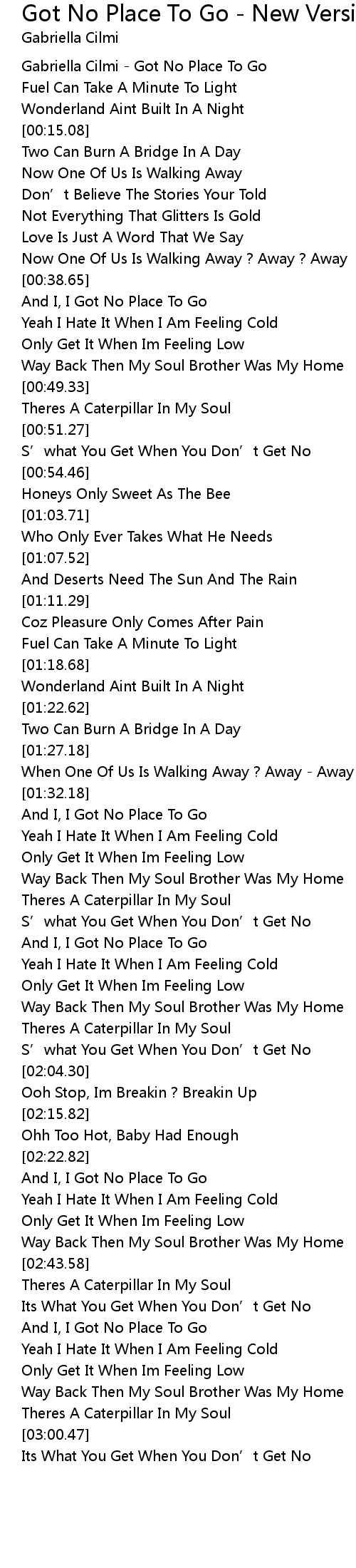 | [00:00.17] | Gabriella Cilmi Got No Place To Go |