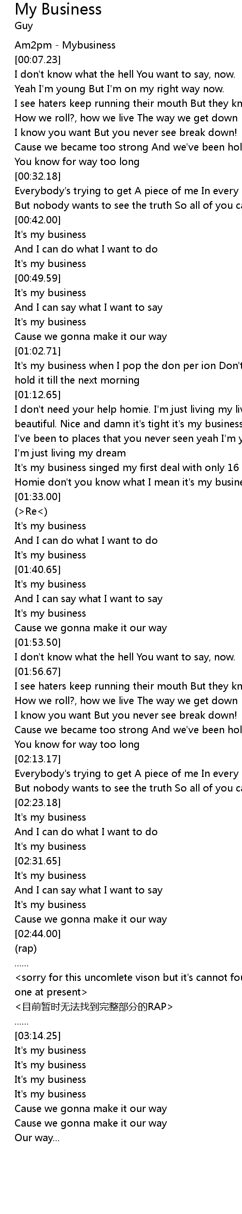 | [01:17.62] | I don't need your help homie. I'm just living my live my live is beautiful. Nice and damn it's tight it's my business. |