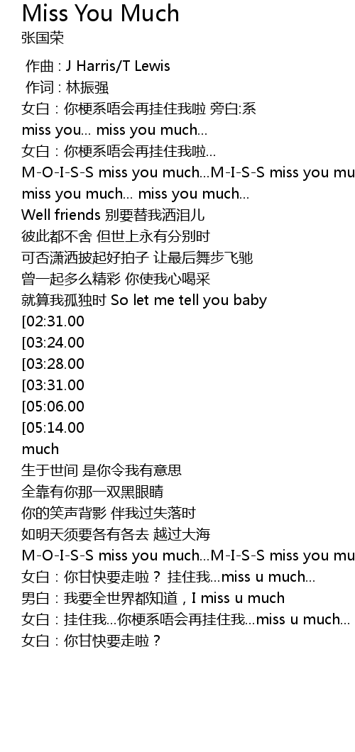 | [05:30.00][05:14.00][03:10.00][02:54.00] | I miss you much baby I really miss you much |