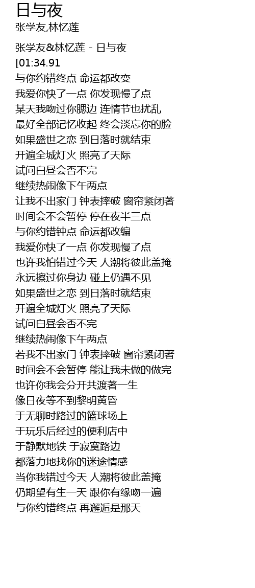 | [00:01.78] | 张学友&林忆莲 - 日与夜 |