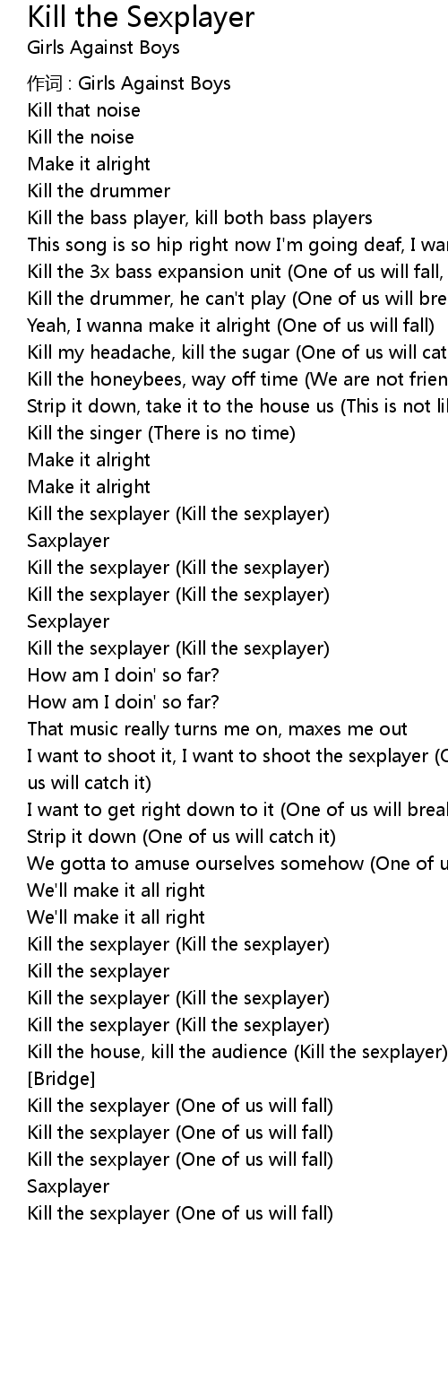 | I want to shoot it, I want to shoot the sexplayer (One of us will fall, one of us will catch it) | |