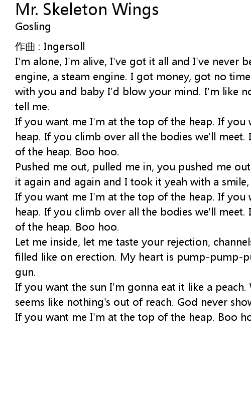| If you want me I' m at the top of the heap. If you want me I' m at the top of the heap. If you climb over all the bodies we' ll meet. If you want me I' m at the top of the heap. Boo hoo. | |