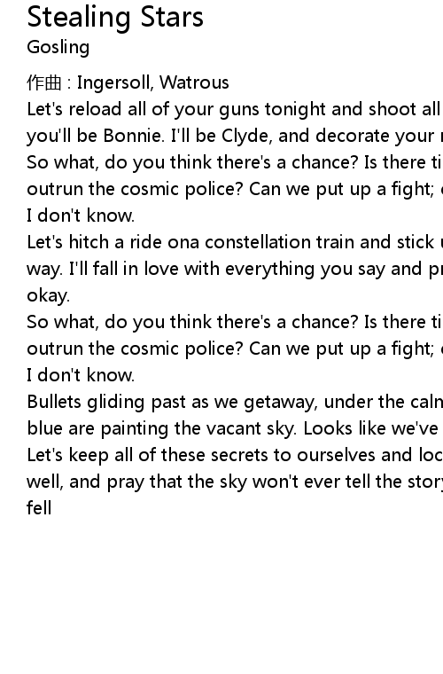 | Let' s hitch a ride ona constellation train and stick up every bank along the way. I' ll fall in love with everything you say and pretend that everything' s okay. | |