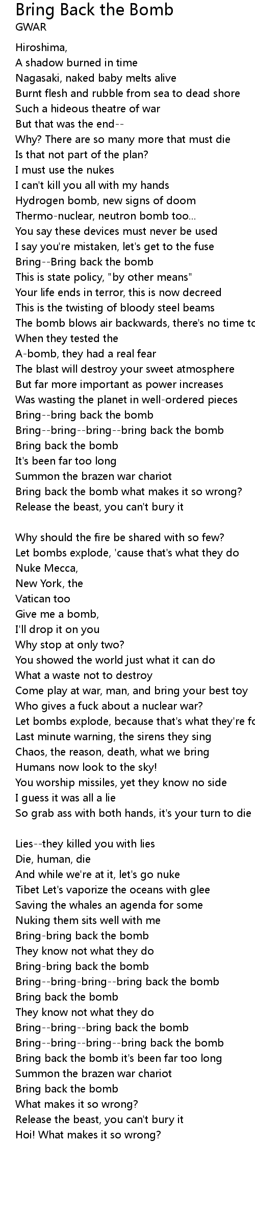 | Bring back the bomb it's been far too long | |