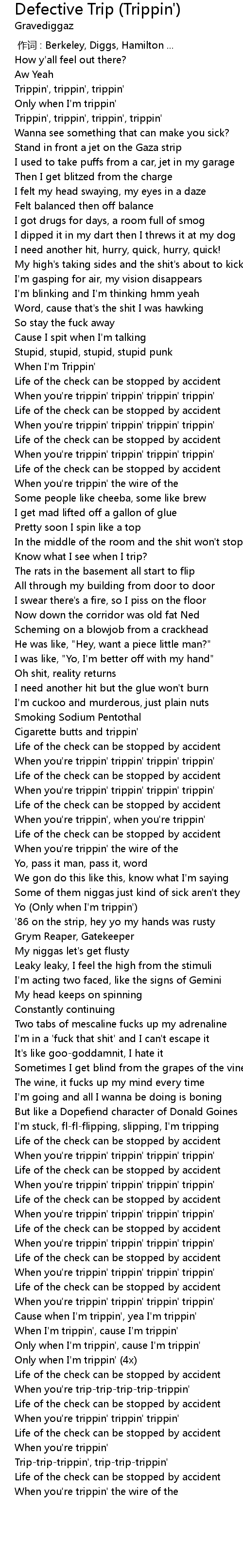 | [00:47.234] | Trippin', trippin', trippin', trippin' |
