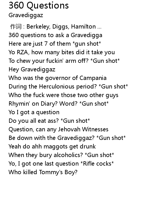 | [00:00.300] | 360 questions to ask a Gravedigga |
