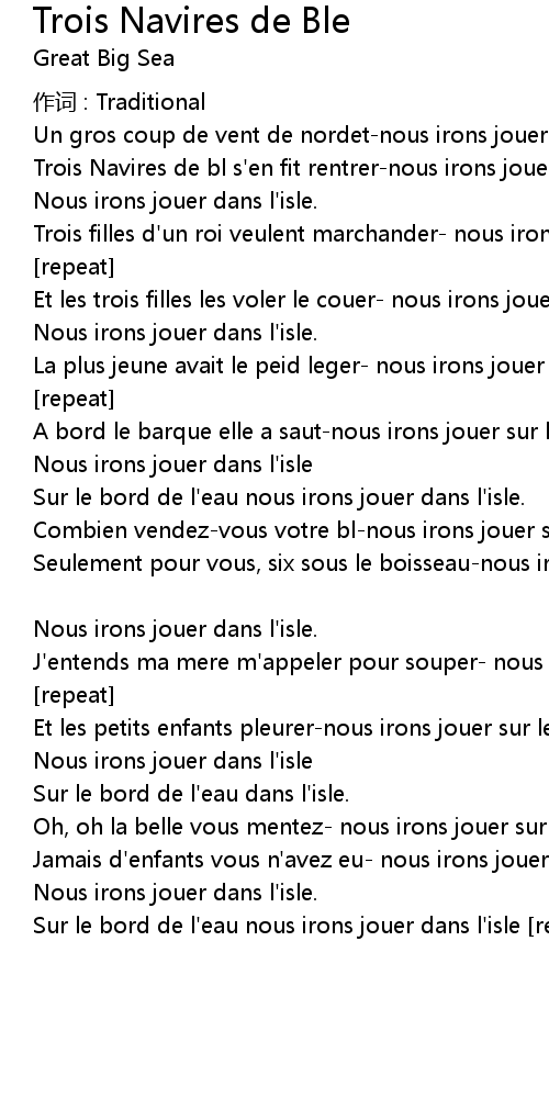 | Trois Navires de bl s' en fit rentrernous irons jouer sur le bord de l' eau. | |