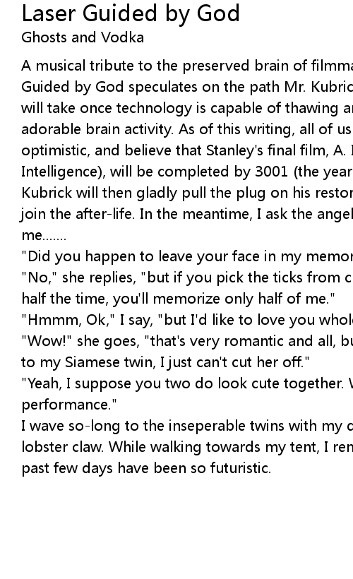 A musical tribute to the preserved brain of filmmaker Stanley Kubrick, Laser Guided by God speculates on the path Mr. Kubrick's cryogenically frozen head will take once technology is capable of thawing and restoring 100% of his adorable brain activity. As of this writing, all of us at the laboratory are optimistic, and believe that Stanley's final film, A. I. (Artifical Intelligence), will be completed by 3001 (the year the wheel becomes obsolete). Kubrick will then gladly pull the plug on his restored existence and permanently join the after-life. In the meantime, I ask the angel-faced girl sitting next to me....... |
