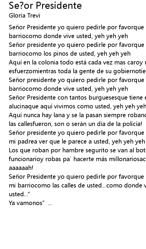 | Señor Presidente yo quiero pedirle por favorque pavimente las calles de mi barriocomo donde vive usted, yeh yeh yeh | |