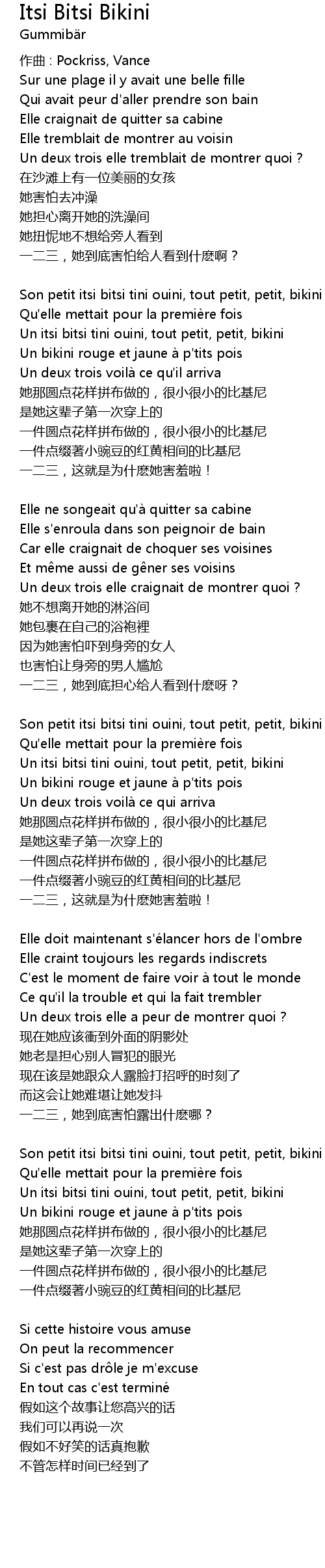 | Son petit itsi bitsi tini ouini, tout petit, petit, bikini | |
