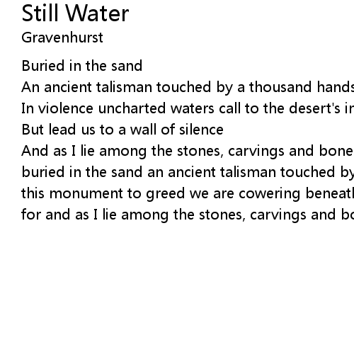 | And as I lie among the stones, carvings and bones the still waters run deep buried in the sand an ancient talisman touched by a thousand hands in violence this monument to greed we are cowering beneath is crushing everything we fought for and as I lie among the stones, carvings and bones the still waters run deep |